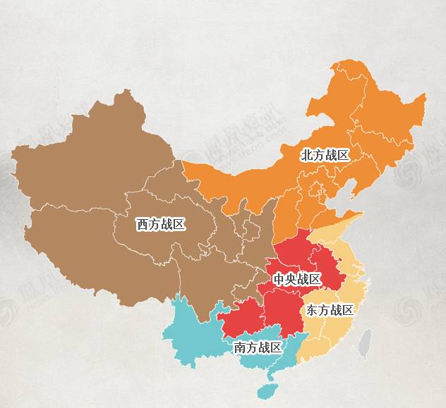 補充完昨天一些戰友的疑問,我們再談談傳說中的7軍區改5戰區。據鳳凰軍情觀察室的報道,我國軍改將會把7大軍區改為南方戰區、北方戰區、西方戰區、東方戰區和中央戰區,至于名字是否如此現在還不能百分百確認,但應該八九不離十。很多人不明白為何如此改革,一些解讀僅僅是將原來軍區轄管的中國地圖進行了一下重新分配,將七大軍區改成了五大戰區,如下圖: